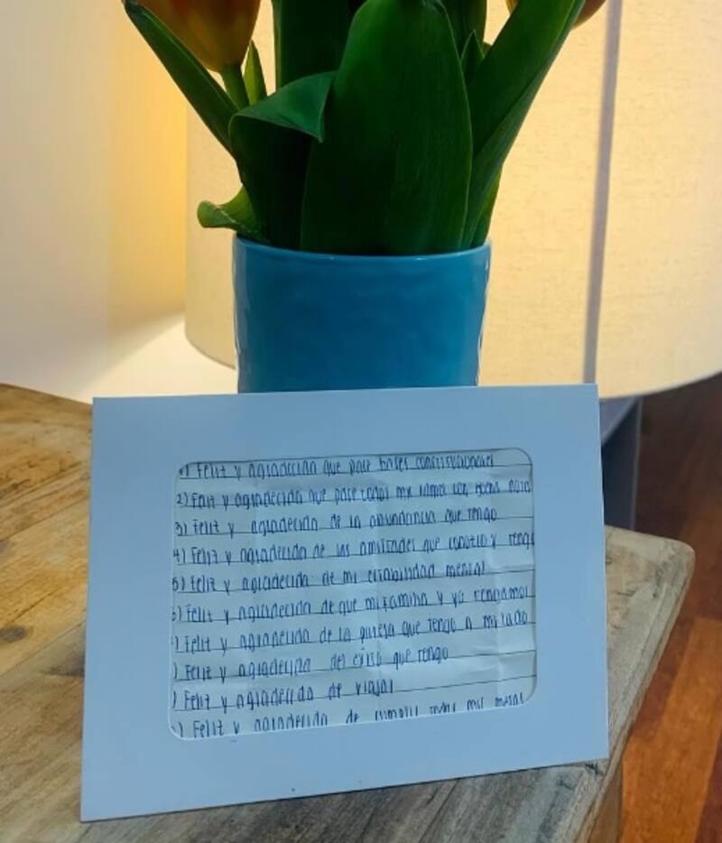 En una hoja de papel, Trini escribió las 10 cosas por las que se encontraba feliz y agradecida: