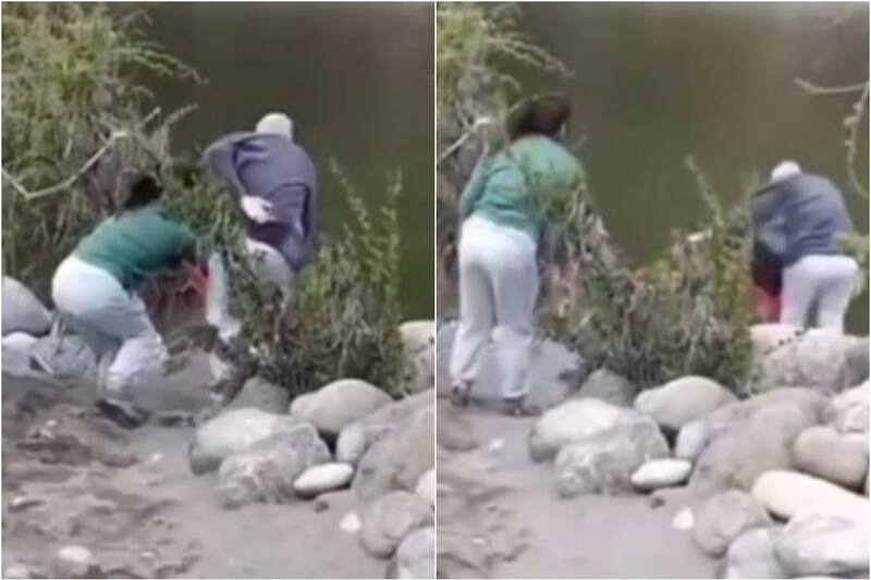 Tal como se puede ver en el registro, la mujer se abalanzó y empujó al abuelo al río, mientras que se pueden escuchar los llantos de la nieta en el fondo. La agresora entonces fue increpada por quien sería el hijo del adulto mayor.