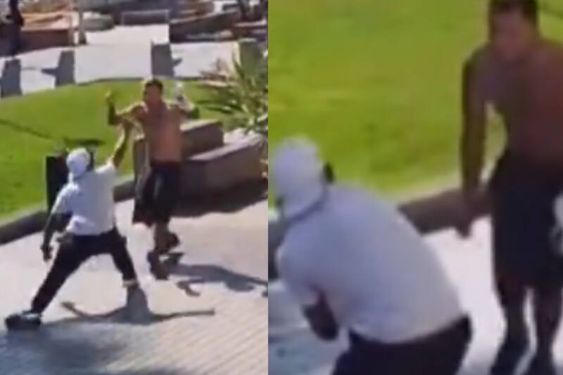 A plena luz del día se aprecia este enfrentamiento digno de la cana o del anime Yū Yū Hakusho, en la Plaza Sotomayor, un lugar céntrico de la ciudad, donde se ven estas arriesgadas acciones.