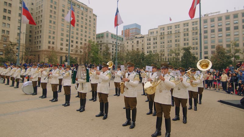 El cambio de guardia en el Palacio de La Moneda —ritual que se realiza día por medio en la Plaza de la Constitución, frente a la sede presidencial, a las diez del día entre semana y a las once sábados, domingos y feriados— parece ser este último miércoles de noviembre un motivo de felicidad, especialmente para dos turistas que ensalzan en inglés la habitual entrada de Carabineros y el orfeón por calle Morandé y otra turista brasileña que inicia una videollamada para comentar el desfile con su novio. La escena, que durará algo más de media hora, asombra también a dos cursos de niños que se amontonan del otro costado, hacia Teatinos, contra la cinta retráctil o sobre el césped.