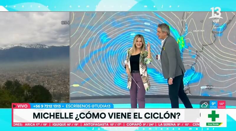 Un jocoso momento protagonizó la meteoróloga Michelle Adam para dar inicio a su informe del tiempo en el matinal Tu Día de Canal 13, marcado por el denominado “ciclón extratropical”.
