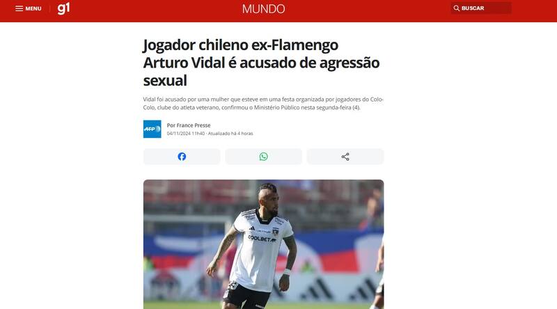 En tanto, en Brasil, Globo expuso: “Jugador chileno exFlamengo Arturo Vidal es acusado de agresión sexual”.