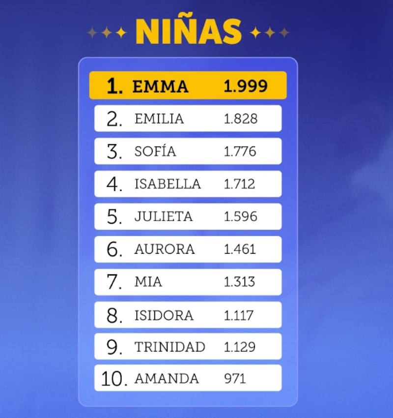 A este top 3 le sigue Isabella (1.712); Julieta (1.596), Aurora (1.461), Mía (1.313), Isidora (1.117), Trinidad (1.129) y Amanda (971).