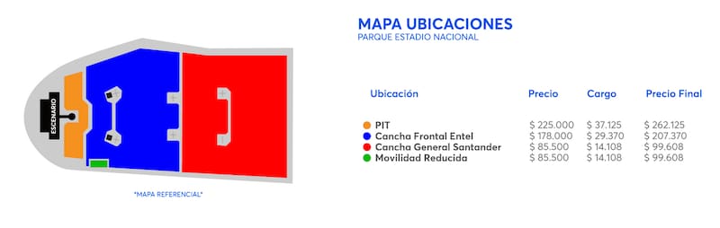 Lo llamativo es que el espectáculo solo tendrá sectores de cancha, con valores que van desde los $99.608 para Cancha General y Movilidad Reducida, hasta los $262.125 del sector PIT, el más próximo al escenario.