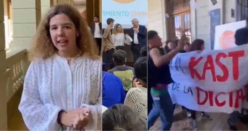 “Lamentablemente, este acto se vio interrumpido ya que miembros de las Juventudes Comunistas y del partido del Presidente Gabriel Boric, Convergencia Social, nos interrumpieron la charla, se pararon con un lienzo afuera de la sala, tratando de entrar por las puertas que se encontraban cerradas”, acusó la joven.