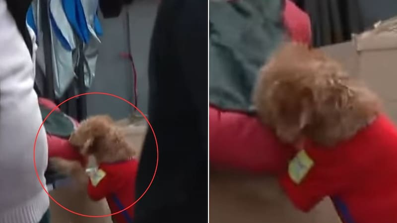 Sin que nadie lo notara y en medio del alboroto, un pequeño canino se escabulló entre la gente, tomó una cama para mascotas y se fue raudo.