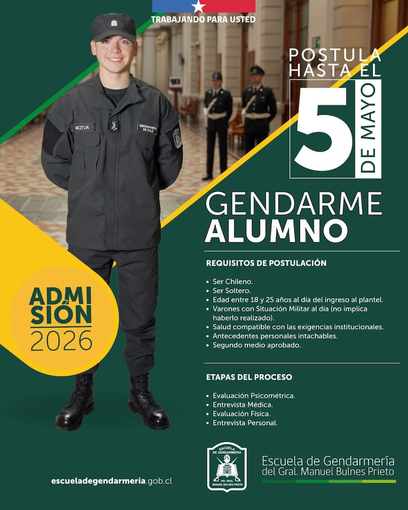 Para mayor información pueden visitar el sitio web www.escueladegendarmeria.gob.cl, o escribir al correo electrónico admision.escuela@gendarmeria.cl.