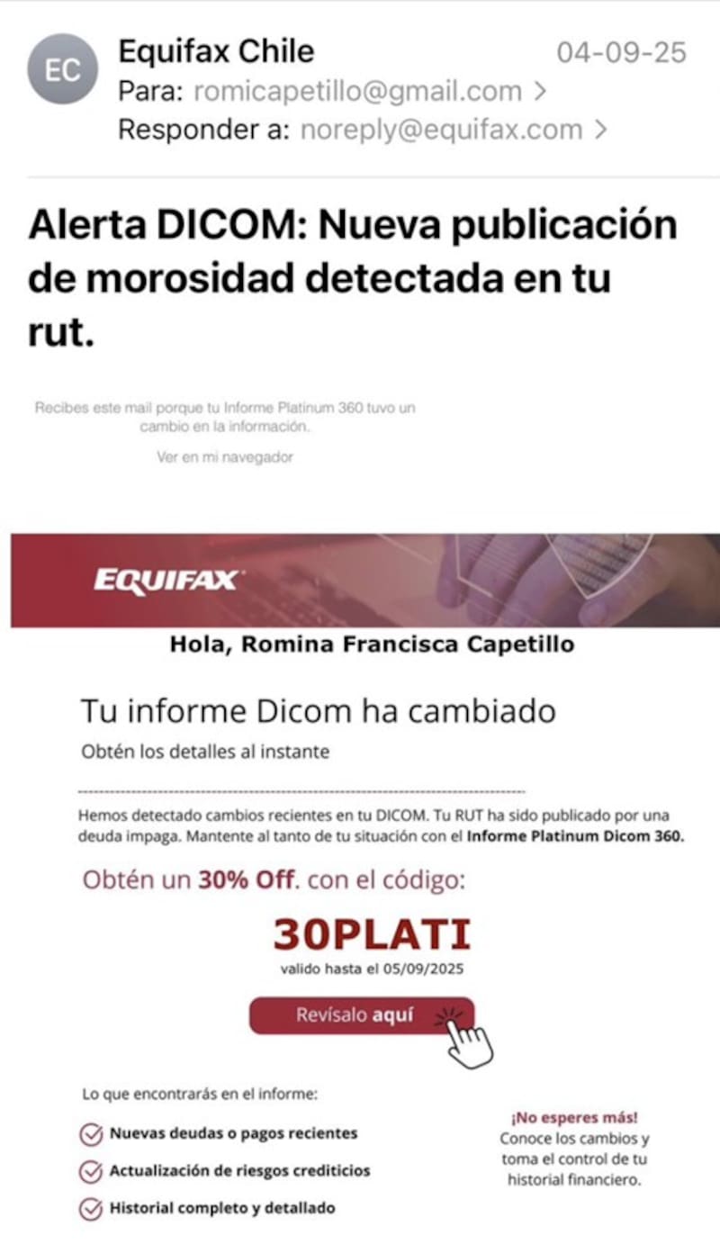 Con ese asunto destacado llegó a decenas de usuarios un correo cuyo contenido ofrecía un descuento en el Informe Platinum 360. Y claro, con la preocupación que acarrea un enunciado así, sobre todo al leer que está vinculado a DICOM, no pocos pagaron el informe para abonar lo que hiciera falta. Pero lo que se encontraron fue que no existía ninguna deuda ni publicación vigente. Parecía en realidad un engaño de la empresa Equifax Chile S.A., administradora de la base de datos, para adquirir el producto.