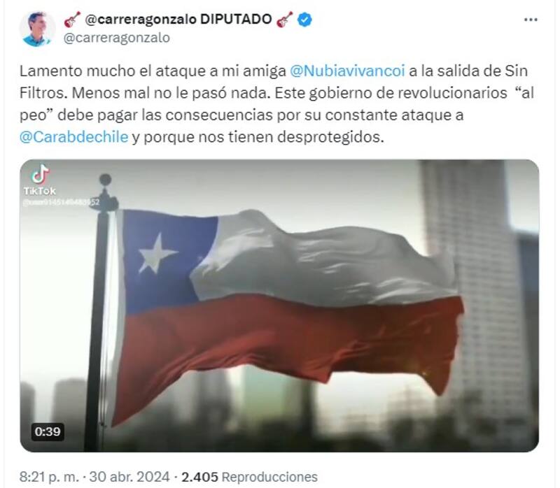 Al salir de los estudios, pasadas las 22:00, en calle Praga de Providencia, la abogada y su marido carabinero se encontraron con disparos y un incidente. Asustada, ella envió un audio a sus cercanos contando la situación. Una parte de esa comunicación se filtró en redes sociales y se armó tamaño escándalo: hablaban de un “ataque” e incluso de un “atentado” contra Vivanco.