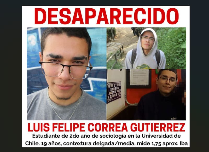 El estudiante de sociología de la Universidad de Chile salió el pasado 19 de agosto desde su casa en San Bernardo y no se supo más de él. La última pista fue la detección de una señal de su teléfono en Viña del Mar, el día 21 de ese mes.