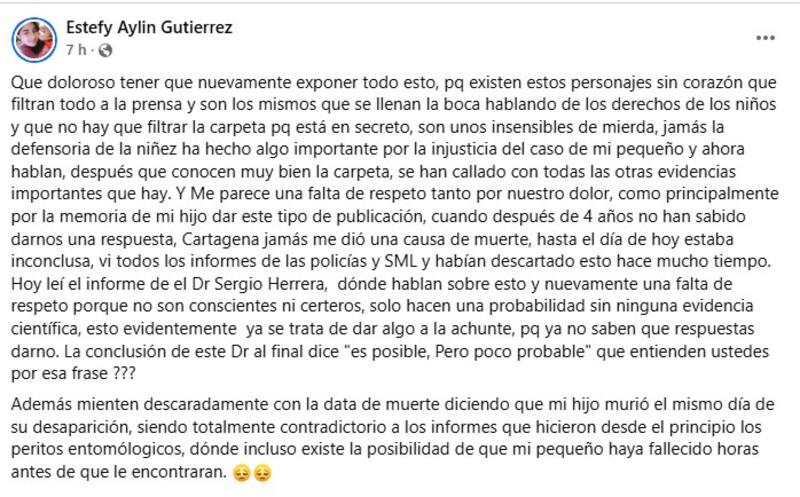 “Me parece una falta de respeto tanto por nuestro dolor, como principalmente por la memoria de mi hijo dar este tipo de publicación, cuando después de 4 años no han sabido darnos una respuesta”, agregó.