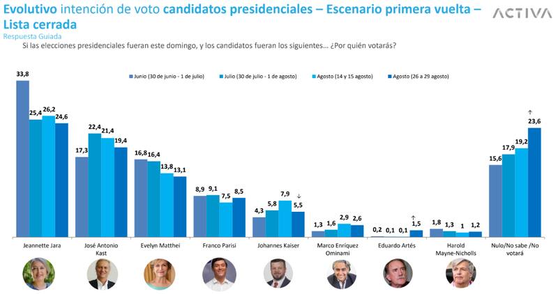 Jara bajó 1,6 puntos; Kast descendió 2 puntos; y Mathhei lo hizo en 0,7. Solo Parisi y Artés aumentaron su resultado en 1 punto. En tanto, los nulos y blancos pasaron de 19,2% a 23,6%.
