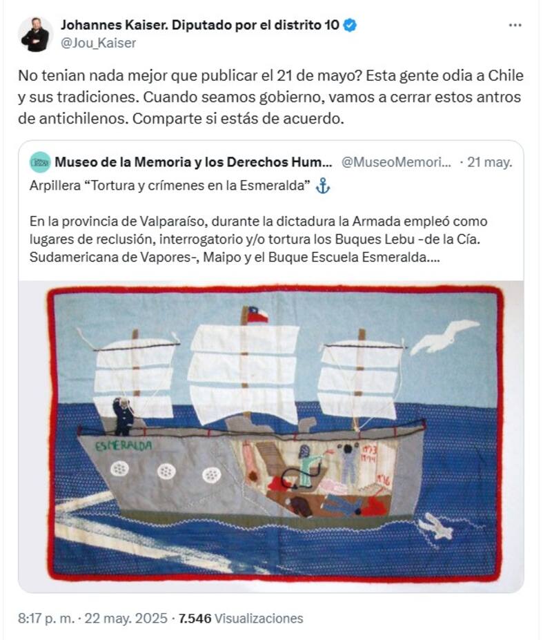 Indignado reaccionó el candidato presidencial del Partido Nacional Libertario, Johannes Kaiser, al ver una reciente publicación en redes sociales del Museo de la Memoria y los Derechos Humanos.