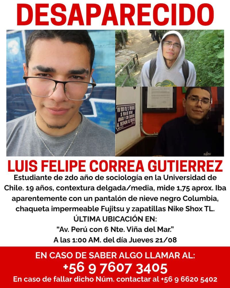 La madrugada del jueves 21 de agosto fue la última vez que se supo algo de Luis Felipe Correa Gutiérrez, estudiante de segundo año de Sociología de la Universidad de Chile. Unas horas antes había dejado su domicilio, en San Bernardo, con dirección a la casa de una amiga. A su madre, Mónica Gutiérrez, le escribió para explicarle que, como se le había hecho tarde, mejor pasaría la noche allá.