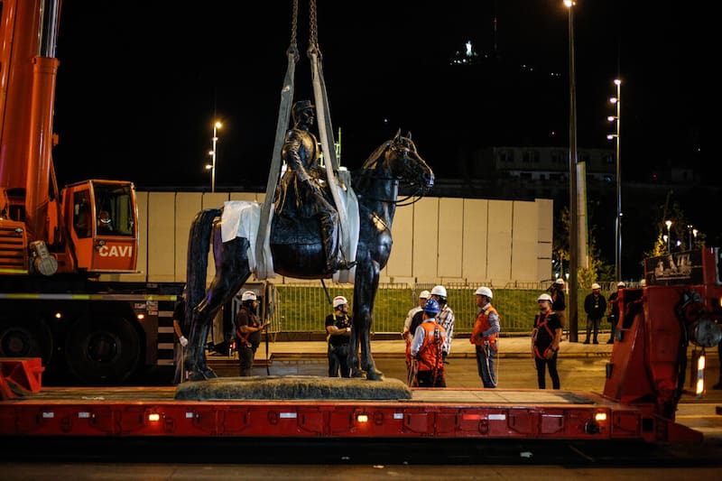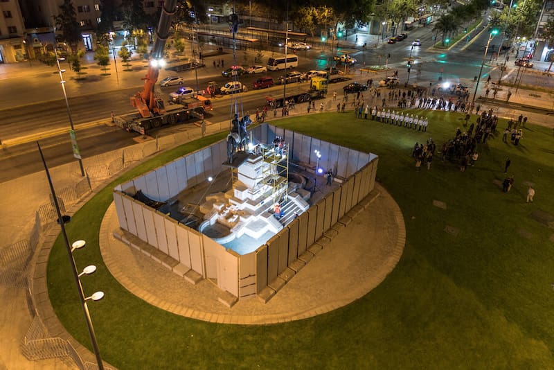 La estatua había sido retirada del lugar el 12 de marzo de 2021 para someterla a trabajos de restauración, luego de los daños que sufrió durante las manifestaciones vinculadas al estallido social.