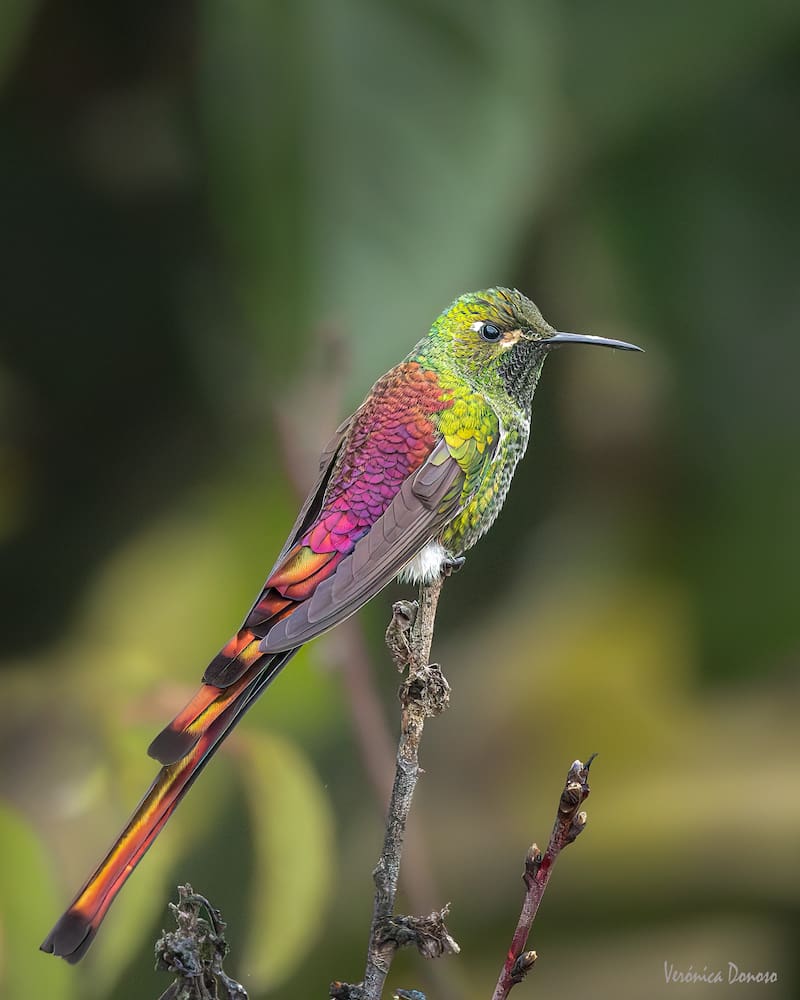 Tomó su celular, lo grabó, publicó el registro de sus redes sociales y luego gugleó, teniendo en cuenta la principal característica que le notó: “Colibrí cola larga“, y resultó que se trataba del Sappho sparganurus, también conocido como “picaflor cometa”.