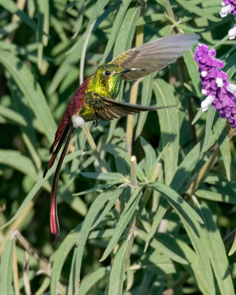 A la observadora, siendo que se trata de un macho solitario, le sorprendió que “está muy activo cuidando su territorio de los picaflores chicos, echándolos constantemente cuando se acercan a los árboles o plantas que él visita”, cuenta. Ella no sabía de la existencia de esta especie que mide alrededor de 15 centímetros, así que le sorprendió “especialmente su llamativa cola larga con un colorido que pasa por variados tonos que vienen desde la base de la cabeza”.
