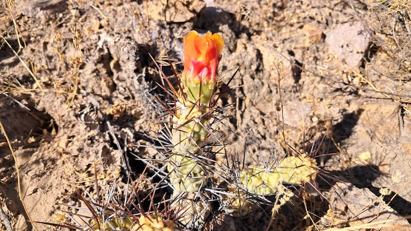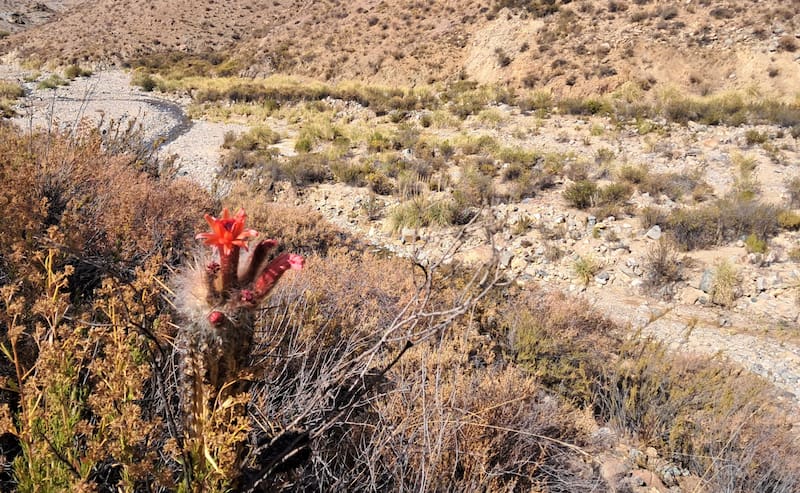 El paisaje se hace vasto, con desniveles, y predominan los matorrales y al menos unas tres especies de cactus, siendo los “gatitos” los más frecuentes y desafiantes; y además hay uno del género Eriosyce, que es el más llama mi atención, insertado en las piedras a ras del suelo, lleno de espinas que protegen su flor destinada para polinizadores muy pequeños.