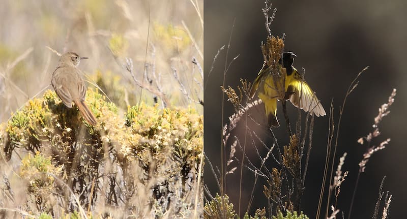 A falta de vehículos en la ruta, vacía, iniciamos el regreso caminando, entre curvas y riscos, y uno que otro bosquecillo de queñuas (Polylepis spp.), los árboles que crecen a mayor altura en el mundo. Al avanzar, eventualmente aparecen canasteros y tijerales listados (Leptasthenura striata) que continúan hacia abajo por las laderas de la quebrada que alberga un riachuelo en el fondo.