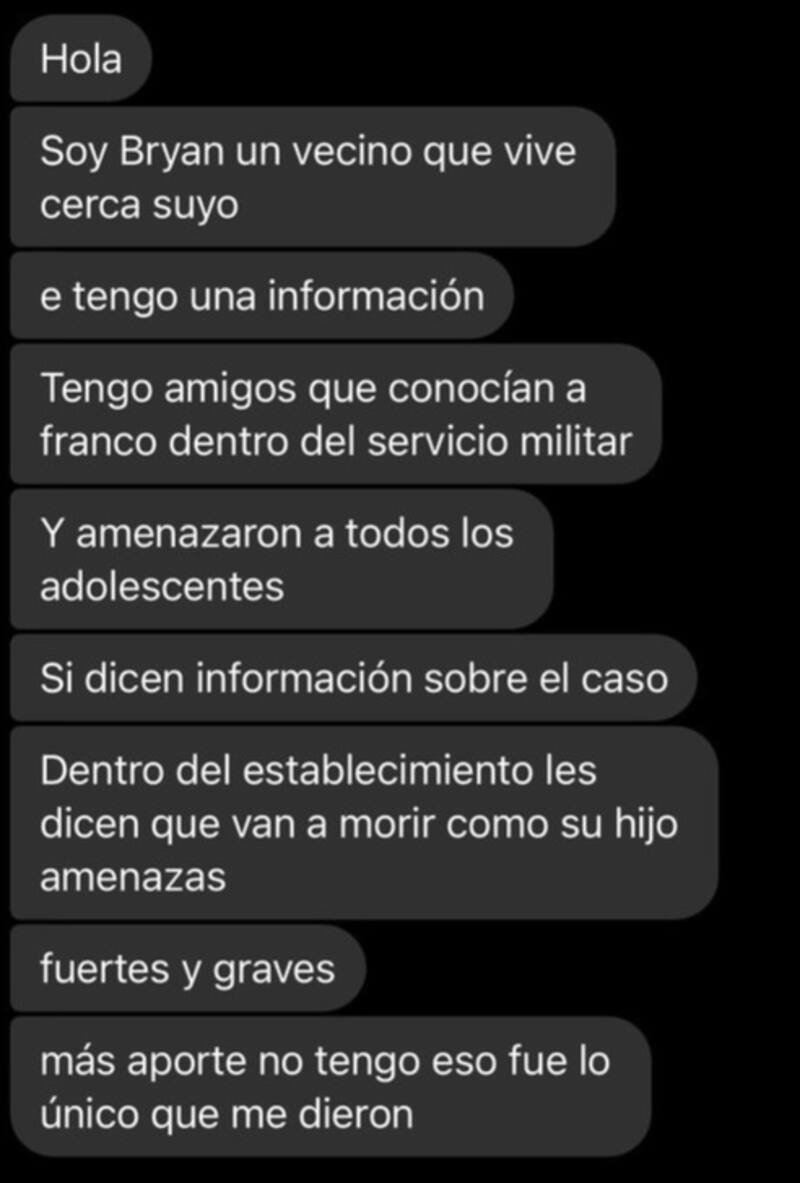 A través de redes sociales, la madre de Franco dio a conocer los mensajes que recibió y que confirmarían las amenazas.