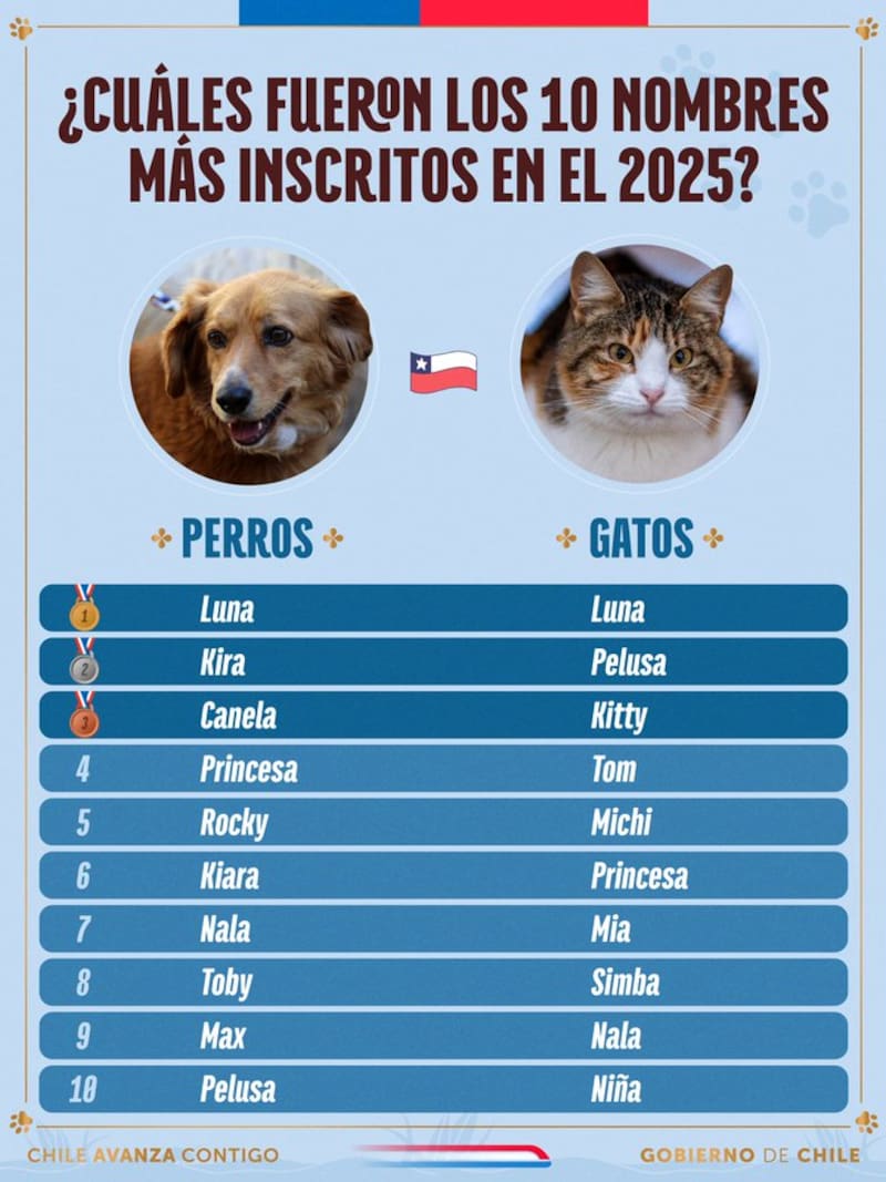 Según el Programa de Tenencia Responsable de Animales de Compañía, perteneciente a la Subsecretaría de Desarrollo Regional y Administrativo (Subdere), el nombre más utilizado tanto para perros como para gatos fue nada menos que LUNA.