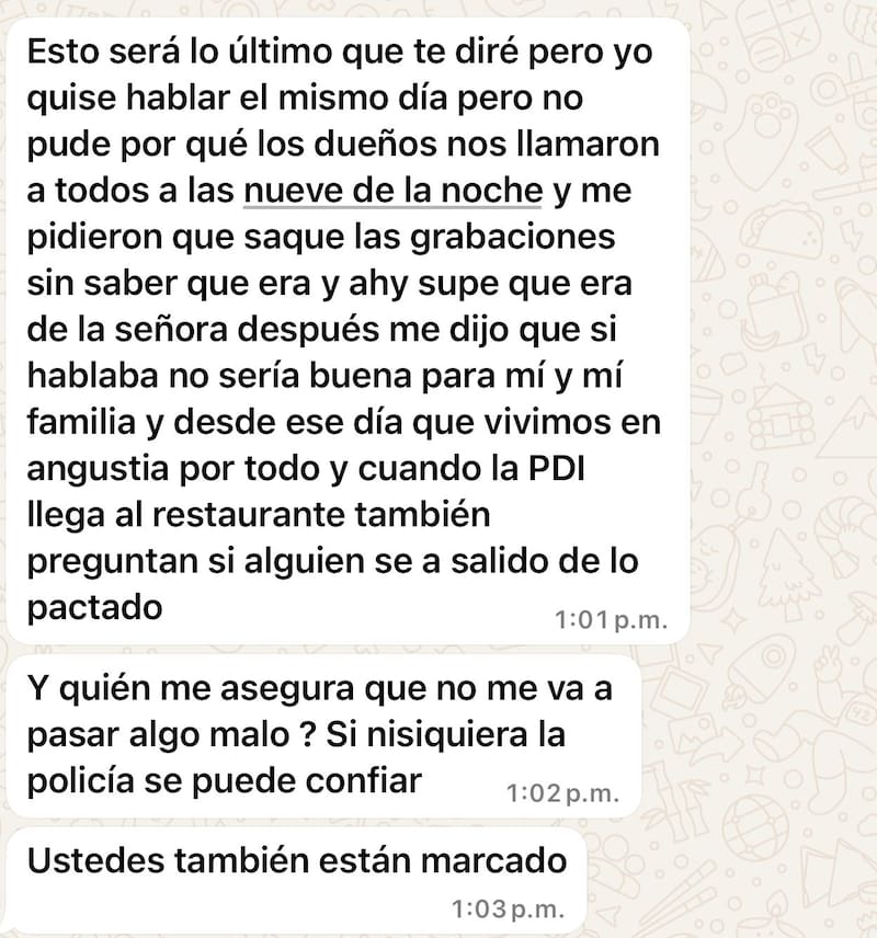 “Esto será lo último que te diré, pero yo quise hablar el mismo día, pero no pude porque los dueños nos llamaron a todos a las nueve de la noche y me pidieron que saque las grabaciones sin saber que era. Y ahí supe que era de la señora. Después me dijo que si hablaba no sería bueno para mí y mi familia, y desde ese día que vivimos en angustia por todo, y cuando la PDI llega al restaurante también preguntan si alguien se ha salido de lo pactado”.