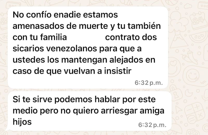 “No confío en nadie, estamos amenazados de muerte y tú también con tu familia. (Nombre de administradora) contrató dos sicarios venezolanos para que a ustedes los mantengan alejados”.