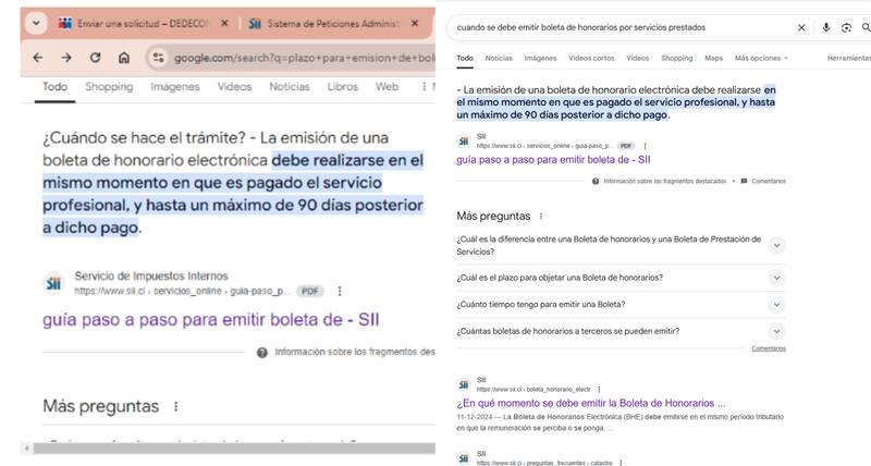 Eso sí, al llamar La Cuarta por teléfono a la Mesa de Ayuda del SII, la información que entregan es que un contribuyente tendría un plazo de “tres meses” para la emisión de una boleta de honorarios y que aquella reglamentación no habría sido “actualizada” por otro plazo. Esta es la misma respuesta que arroja el buscador al poner la pregunta: “Cuándo se debe emitir la boleta de honorarios por servicios prestados”.