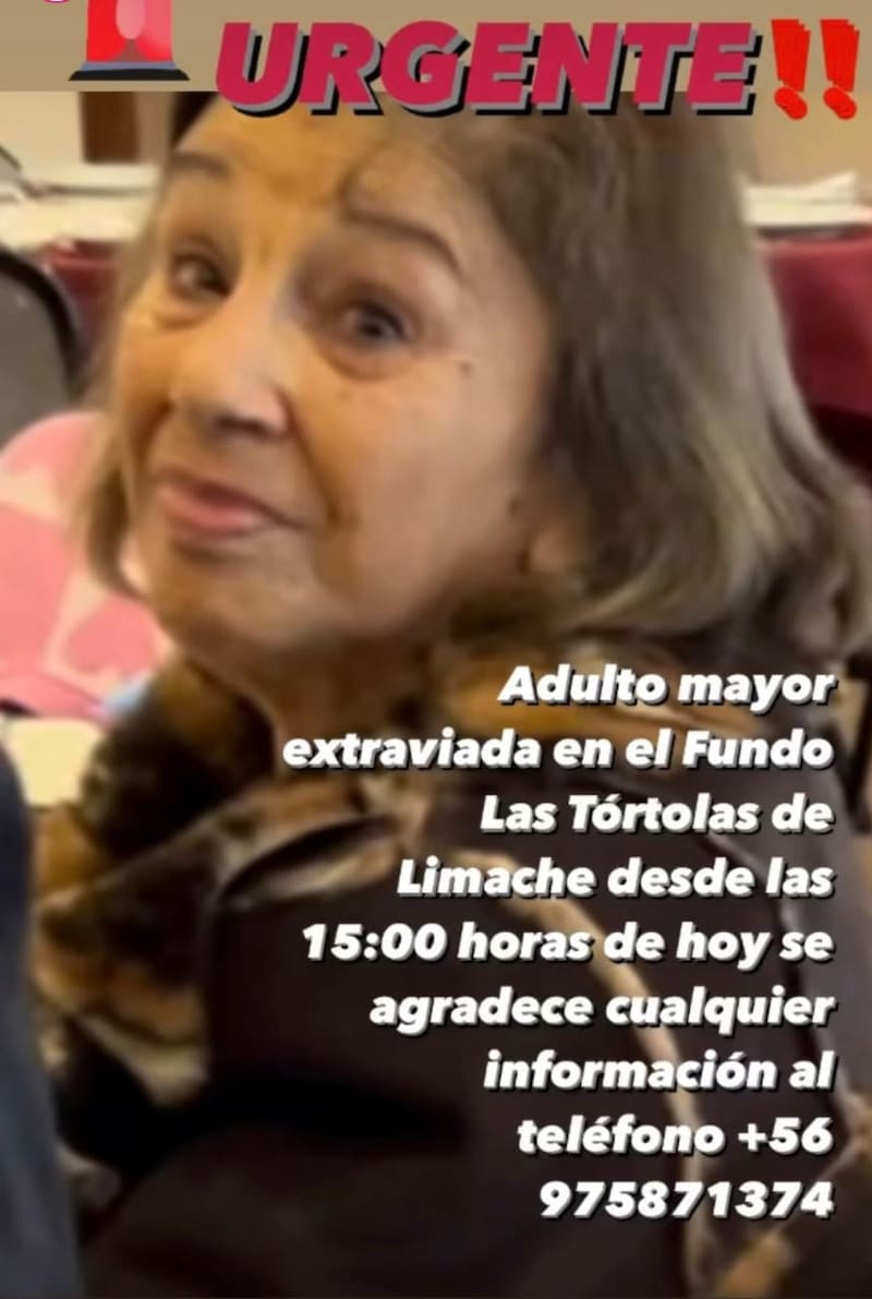 Una terrible pesadilla vive la familia de una adulta mayor de 85 años que desapareció de un momento a otro, justo cuando compartían un almuerzo por el Día de la Madre en la comuna de Limache, Región de Valparaíso.