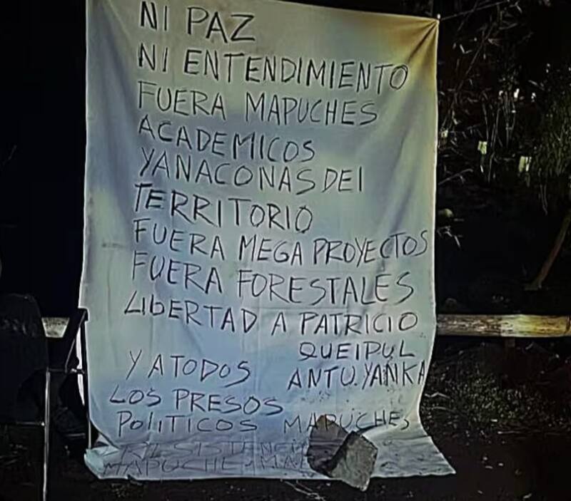 “Ni paz ni entendimiento. Fuera mapuches académicos yanaconas del territorio, fuera megaproyectos, fuera forestales”, escribieron.