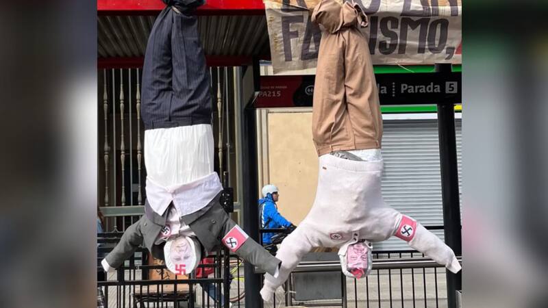 La imagen fue captada durante las manifestaciones en la capital por el día del trabajador, donde imitaban la ejecución del dictador italiano y líder del Fascismo, Benito Mussolini y su amante Clara Petacci.