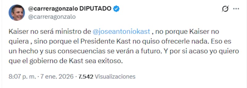 "Kaiser no será ministro de José Antonio Kast, no porque Kaiser no quiera, sino porque el Presidente Kast no quiso ofrecerle nada", disparó el congresista en su cuenta de X.