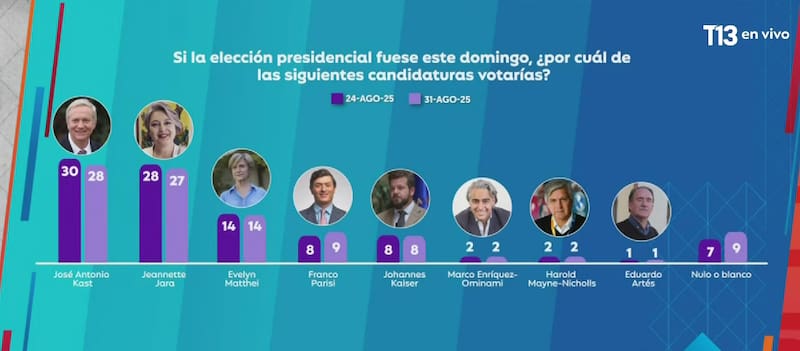 Aquí, Kast bajó de 44 a 42%; Jara se mantuvo en 28%; Matthei subió de 9 a 10%; y Parisi pasó del 4 al 5%.