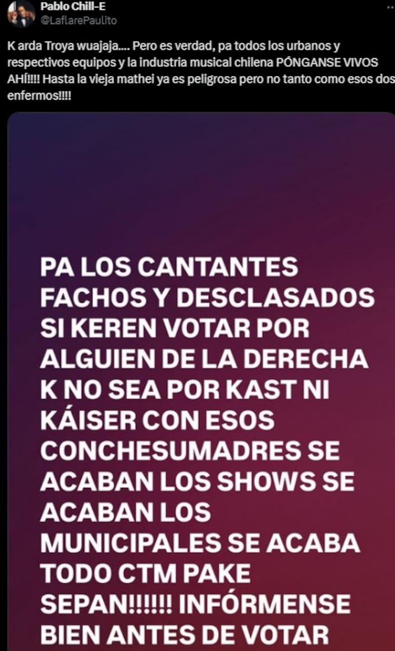 “Pa’ los cantantes fachos y desclasados, si quieren votar por alguien de la derecha que no sea por Kast ni Kaiser, con esos conchesumadres se acaban los shows, se acaban los municipales, se acaba todo, CTM. Pa’ que sepan, infórmense bien antes de votar”, añadió.