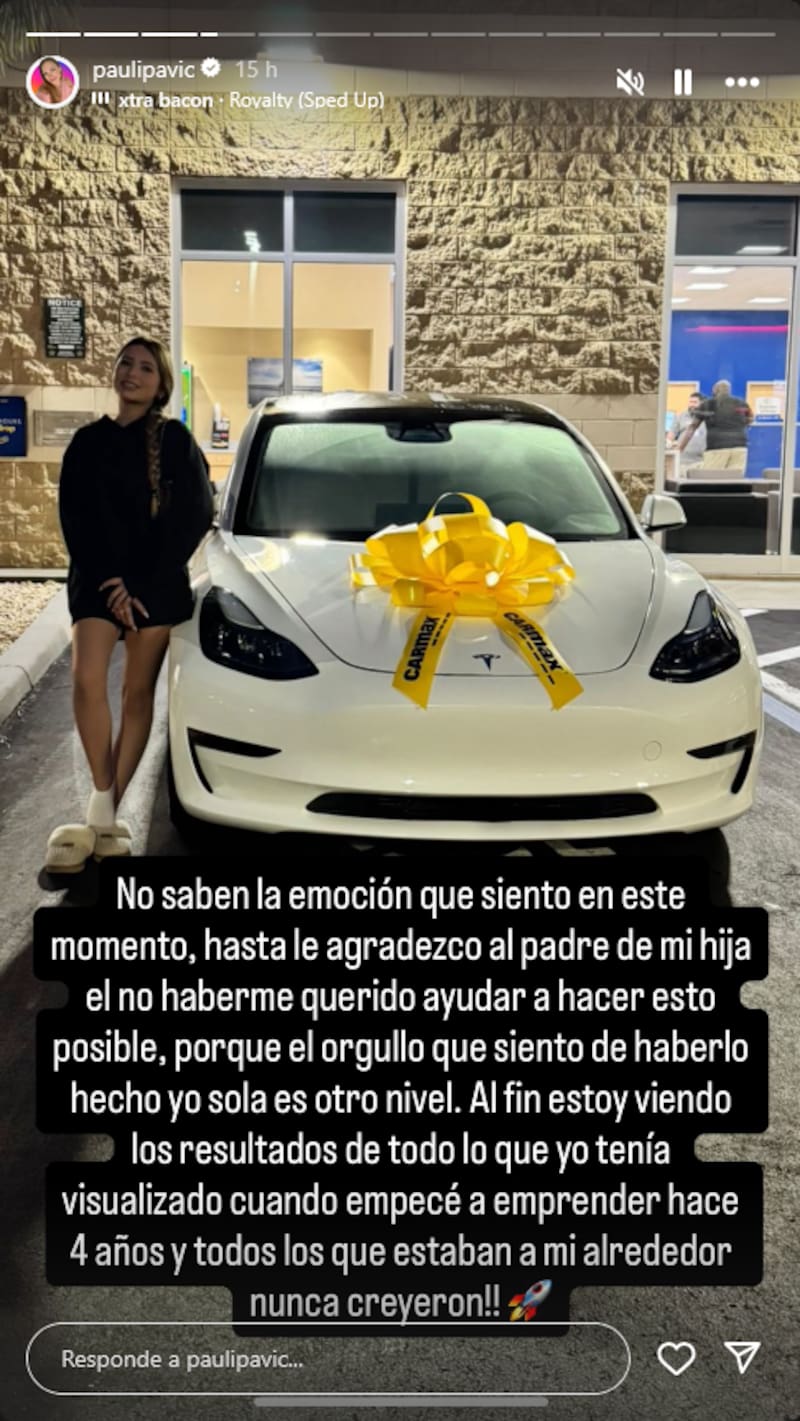 La emprendedora mostró el lujoso vehículo en sus historias de Instagram y, de paso, aprovechó para enviar un recado a su ex.