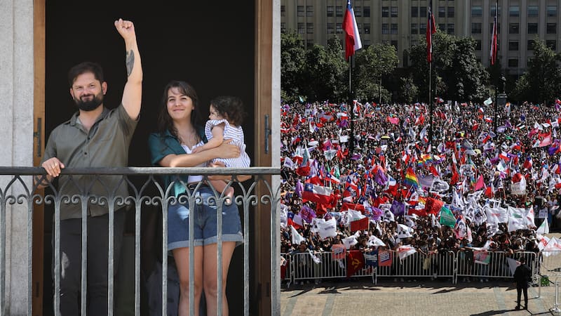 En compañía de su pareja Paula Carrasco y su hija Violeta, el presidente Gabriel Boric llegó hasta La Moneda, para participar en un acto de despedida de sus adherentes, que se congregaron en la Plaza de la Constitución.