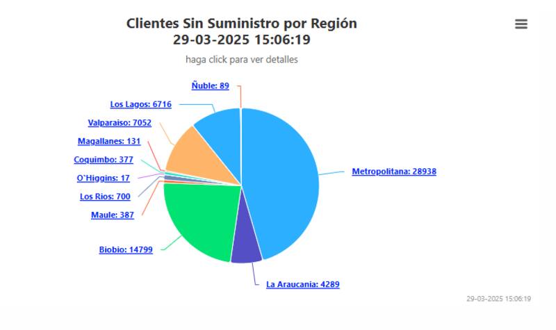 Y aunque la región Metropolitana es la zona con mayores problemas, también se presentaron interrupciones del servicio en la región del Bío Bío, con casi 15 mil clientes afectados, y Valparaíso, con más de siete mil.