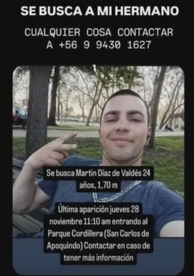Horas de angustia vive la familia de Martín Díaz de Valdés, el joven de 24 años que permanece desaparecido desde el jueves 28 de noviembre, tras internarse en el Parque Cordillera de San Carlos de Apoquindo, en la comuna de Las Condes.