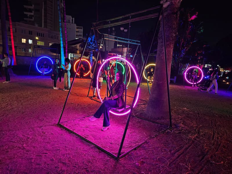 Y finalmente tenemos a Infancia, curiosamente la última estación del paseo y que es donde la mayoría del mundo espera para sacarse la foto y video que más les gusta. La instalación está conformada por una serie de columpios, rodeados por perfectos círculos de neón en diferentes colores. Por fuera, la imagen ya es lo suficientemente entretenida al ver a todo el mundo jugando en la oscuridad con estos columpios iluminados, y cuando ya es tu turno, poder columpiarte mientras te graban y sacas fotos, ojalá en tu color favorito, es un gran cierre para sacar una foto que de seguro tendrá decenas de likes (yo ya llevo casi 50).
