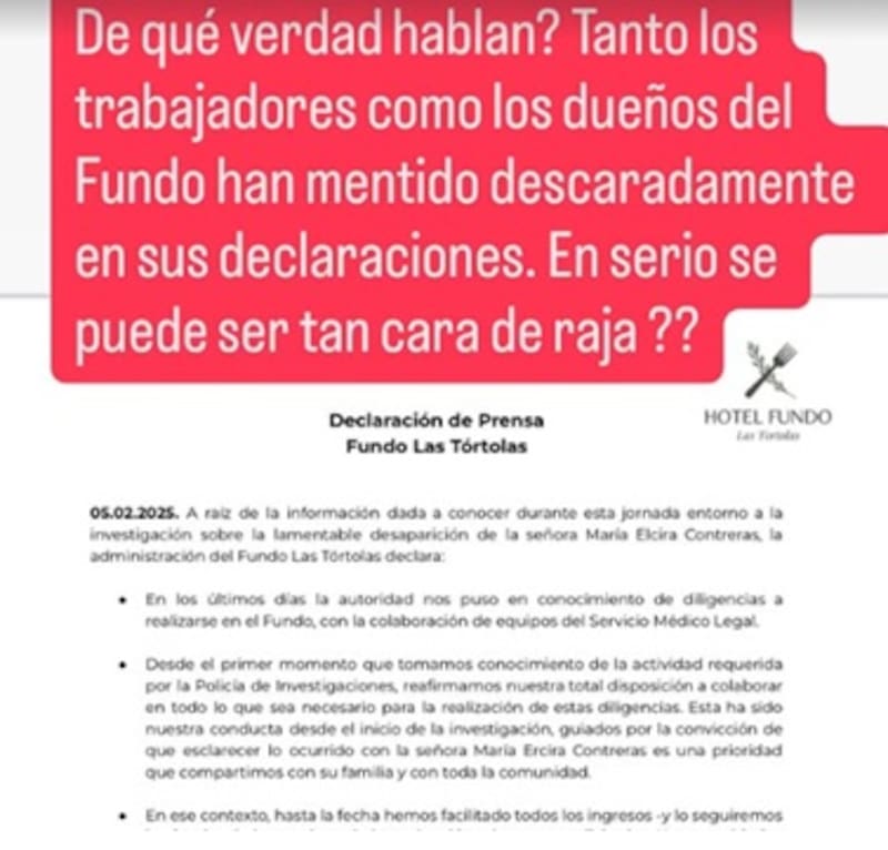 Indignación total generó en Carla Hernández, nieta de María Elcira Contreras, un reciente comunicado del fundo Las Tórtolas en relación a la diligencia clave que se realizará en el lugar, a casi dos años de la desaparición de su abuela.