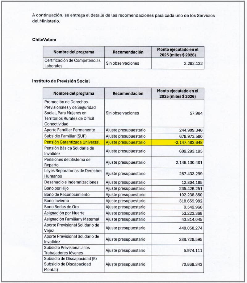 Ahora, Ciper Chile expuso un oficio firmado por el ministro de Hacienda, Jorge Quiroz, donde “recomienda” al Ministerio del Trabajo un “ajuste presupuestario” en la PGU y una serie de otras pensiones, bonos y subsidios, de cara al Presupuesto de la Nación 2027.