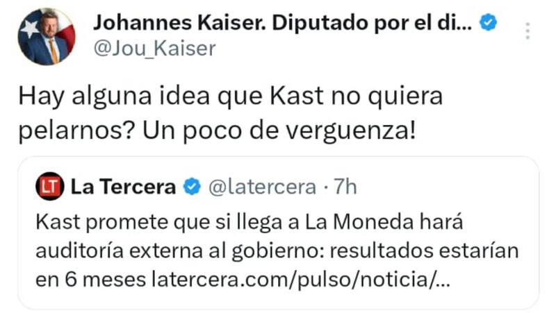 Sin embargo, la idea de la revisión de las cuentas del Estado, ha sido repetida por Kaiser, quien usó su cuenta en X para arremeter contra el republicano preguntando: “¿Hay alguna idea que Kast no quiera pelarnos? ¡Un poco de vergüenza!“. Posteriormente, borró la publicación.