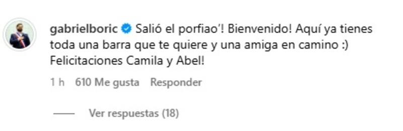 “Salió el porfiao’! Bienvenido! Aquí ya tienes toda una barra que te quiere y una amiga en camino :) Felicitaciones Camila y Abel!”, escribió el mandatario.