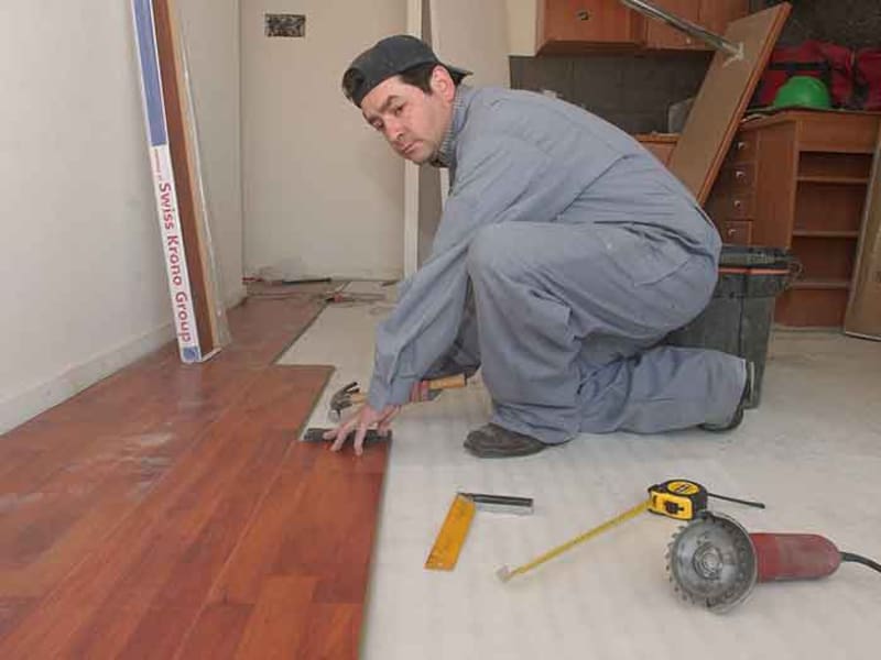 - Debido a su composición, los pisos laminados no deben ser pegados a la superficie, ya que por diferencias de temperatura estos se dilatan y es por eso que su instalación es flotante. Esto se aplica mediante un machihembrado que permite la unión entre las mismas palmetas, las que pueden ser golpeadas con una herramienta llamada taco para su calce completo, o bien por un sistema llamado clic, con el que basta con hacer presión para que se produzca la unión.