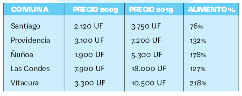 Un departamento en El Golf de 169 metros cuadrados costaba cerca de 7.900 UF el 2009. Hoy, uno incluso más pequeño, de 150 metros construidos, cuesta más de 18.000 UF. ¡10.100 UF más! Una diferencia abismal.