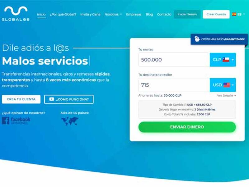 La primera plataforma online del país para hacer transferencias de dinero al extranjero. Actualmente opera en Chile, Colombia, Perú, Argentina y México para poder enviar dinero a más de 60 destinos en el mundo.