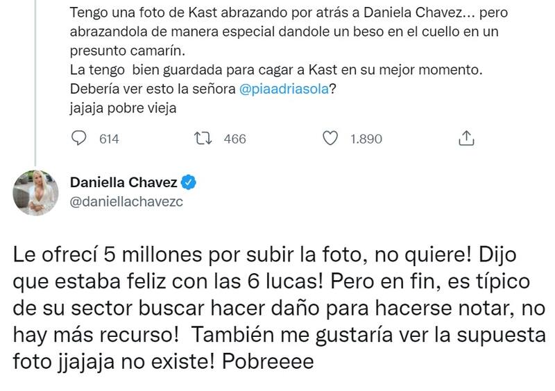Durante las últimas horas, una tuitera advirtió a la conejita Playboy. “Tengo una foto de Kast abrazando por atrás a Daniela Chávez... pero abrazándola de manera especial, dándole un beso en el cuello en un presunto camarín. La tengo bien guardada para cagar a Kast en su mejor momento”.