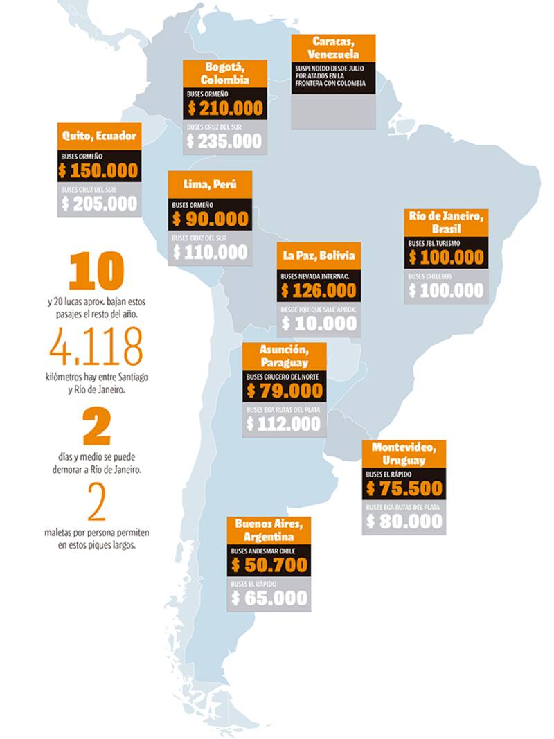 Por ejemplo, un viaje a Río de Janeiro, ida y vuelta, sale a 190 mil pesos en buses JBL. Más datos en la infografía al final de esta nota.