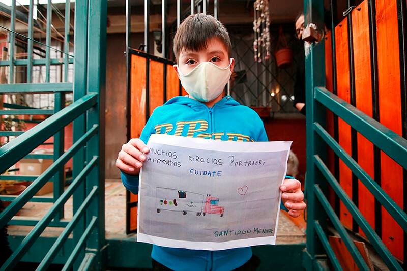 Tras cartón, el menor se sentó en la mesa del comedor de su humilde departamento y dibujó un camión colorido, un corazón y escribió un mensaje: "Gracias por traer alimentos, cuídate. Santiago Menares". Enseguida, descendió por la escalera y se acercó a uno de los funcionarios, para hacerle entrega de su hoja testimonial.