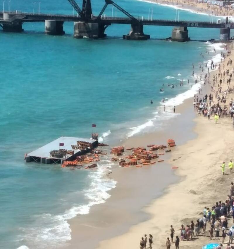 Lo que sí asustó a los imprudentes fue ver una inmensa plataforma de lanzamiento de fuegos artificiales, que estaba anclada mar adentro, acercándose peligrosamente hacia la playa.